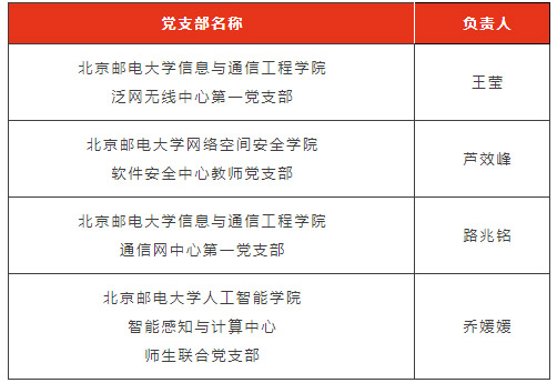 近日,教育部办公厅公布了全国高校“双带头人”教师党支部书记“强国行”专项行动团队名单,北京邮电大学此次申报的4个党支部全部入选!