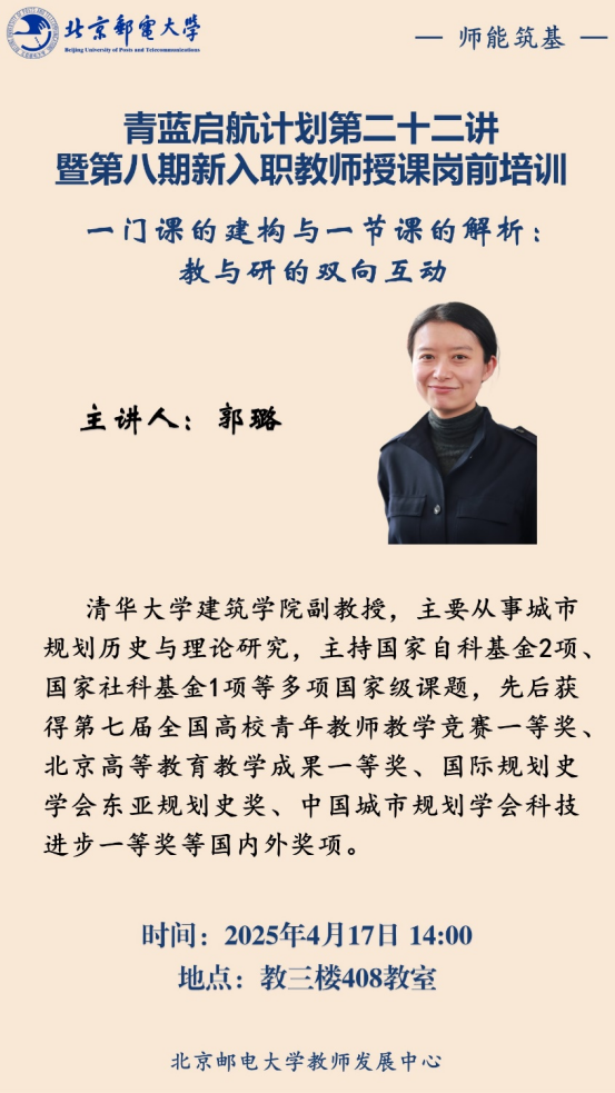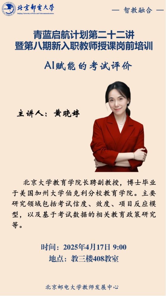 为全面贯彻全国教育大会和党的二十大精神,弘扬教育家精神,提高新入职教师的教学能力,教师发展中心将于2025年4月17日开展青蓝启航计划第二十二讲暨第八期新入职教师授课岗前培训第三讲,分别邀请北京大学黄晓婷副教授、清华大学郭璐副教授,为参训教师作考试评价与教学科研主题培训。