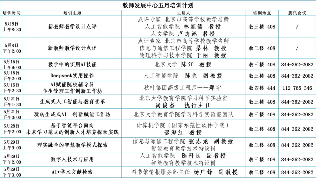 为持续推进教师专业发展,打造多层次、全覆盖的人工智能素养培训体系,全面提升教师人工智能素养和场景驱动下的教学创新能力,教师发展中心决定开展常态化月度教师培训,具体安排如下: