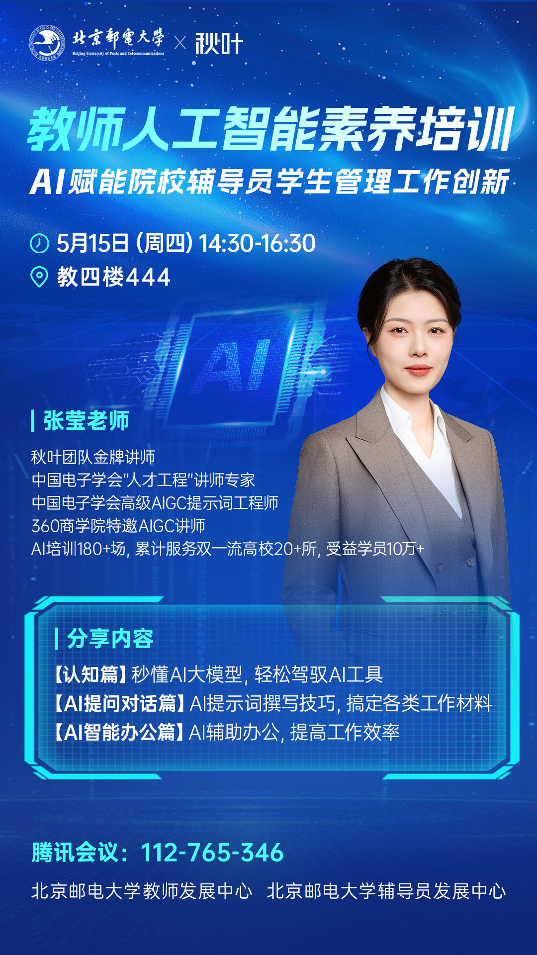 围绕“技术赋能 教学创新”目标,持续推进学校教育数字化转型,教师发展中心系统规划了分层分类的培训计划,旨在全面提升不同岗位、不同水平的教职员工的人工智能素养与专业能力。本期智创工坊是“数智导航计划”第二十二讲,为教师发展中心与辅导员发展中心联合组织的面向我校辅导员的专场培训。旨在提升辅导员运用人工智能技术优化学生管理工作的实践能力,助力其在人工智能时代创新学生管理与服务模式,精准应对学生工作中的新需求与新挑战。