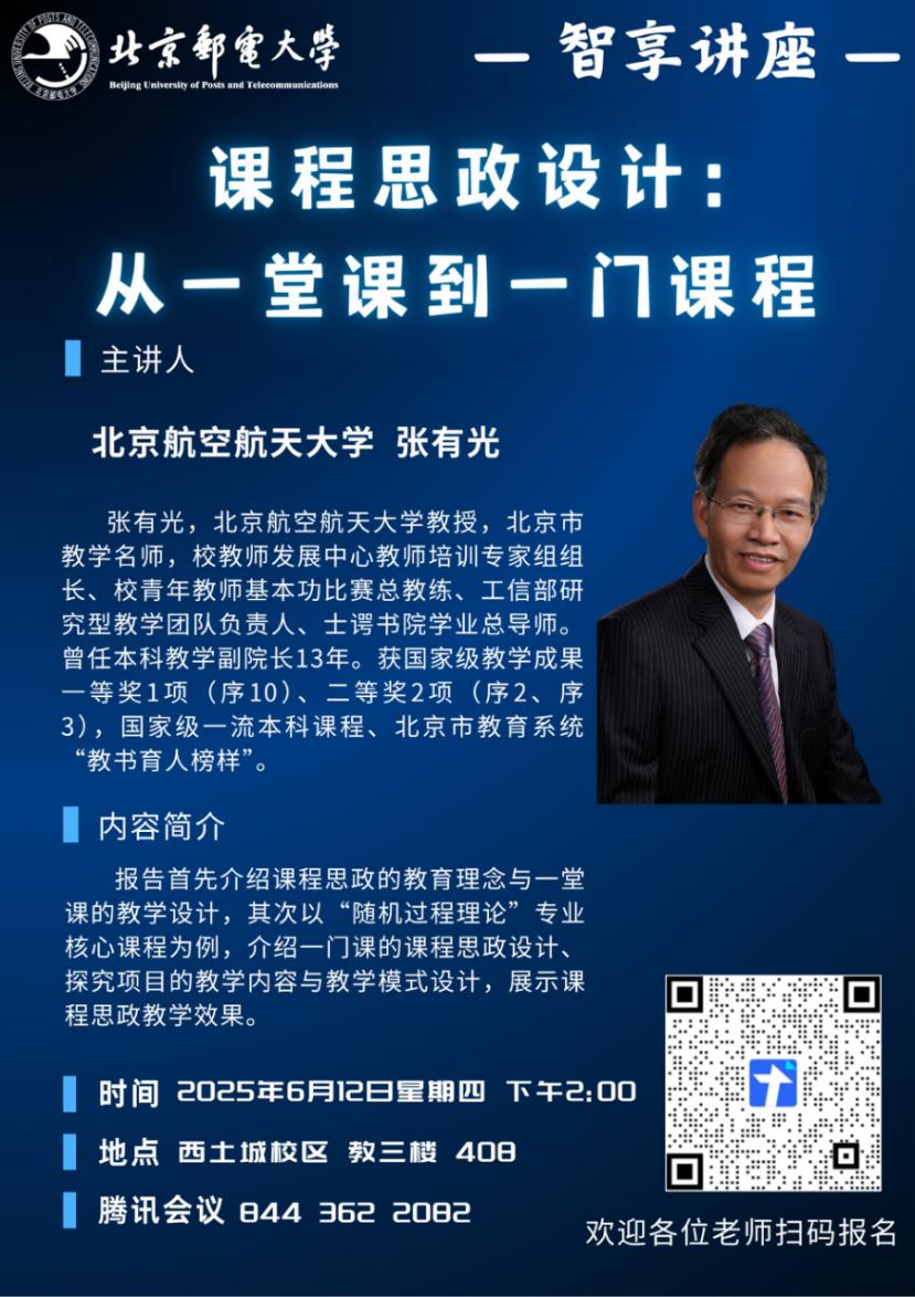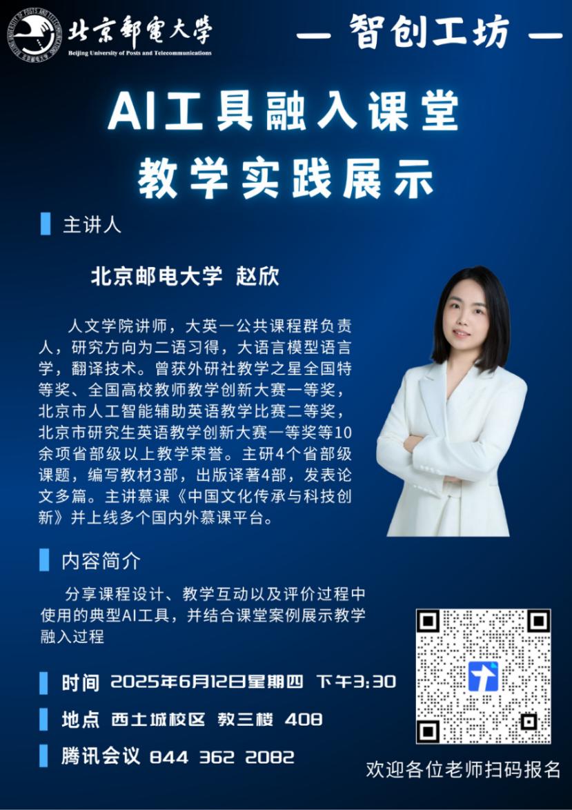 围绕“技术赋能 教学创新”目标,提升教师课程思政建设能力与AI工具应用水平,教师发展中心将于2025年6月12日开展“青蓝启航计划”第二十六讲、“数智导航计划”第二十九讲、第八期新入职教师授课岗前培训第七讲“课程思政与AI课堂工具实践”主题培训。本期智享讲座邀请到全国五一劳动奖章获得者清华大学李蕉副教授和北京航空航天大学张有光教授,分别围绕课程思政与创新人才培养以及课程思政设计进行分享;智创工坊邀请我校人文学院赵欣老师,介绍在课堂教学中运用AI工具的典型案例。